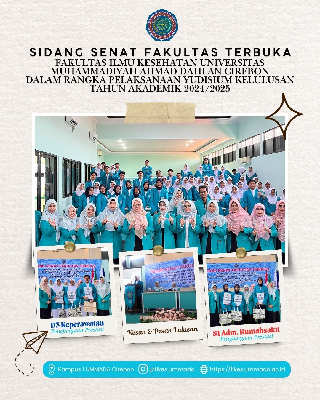 Sidang senat terbuka ini menandai berakhirnya satu babak perjalanan akademik dan dibukanya lembaran baru bagi para lulusan untuk mengabdi kepada masyarakat. Fakultas Ilmu Kesehatan UMMADA Cirebon berharap seluruh lulusan dapat menjadi tenaga kesehatan yang profesional, berintegritas, dan berjiwa islami dalam menjalankan tugasnya di dunia kerja maupun di tengah masyarakat.